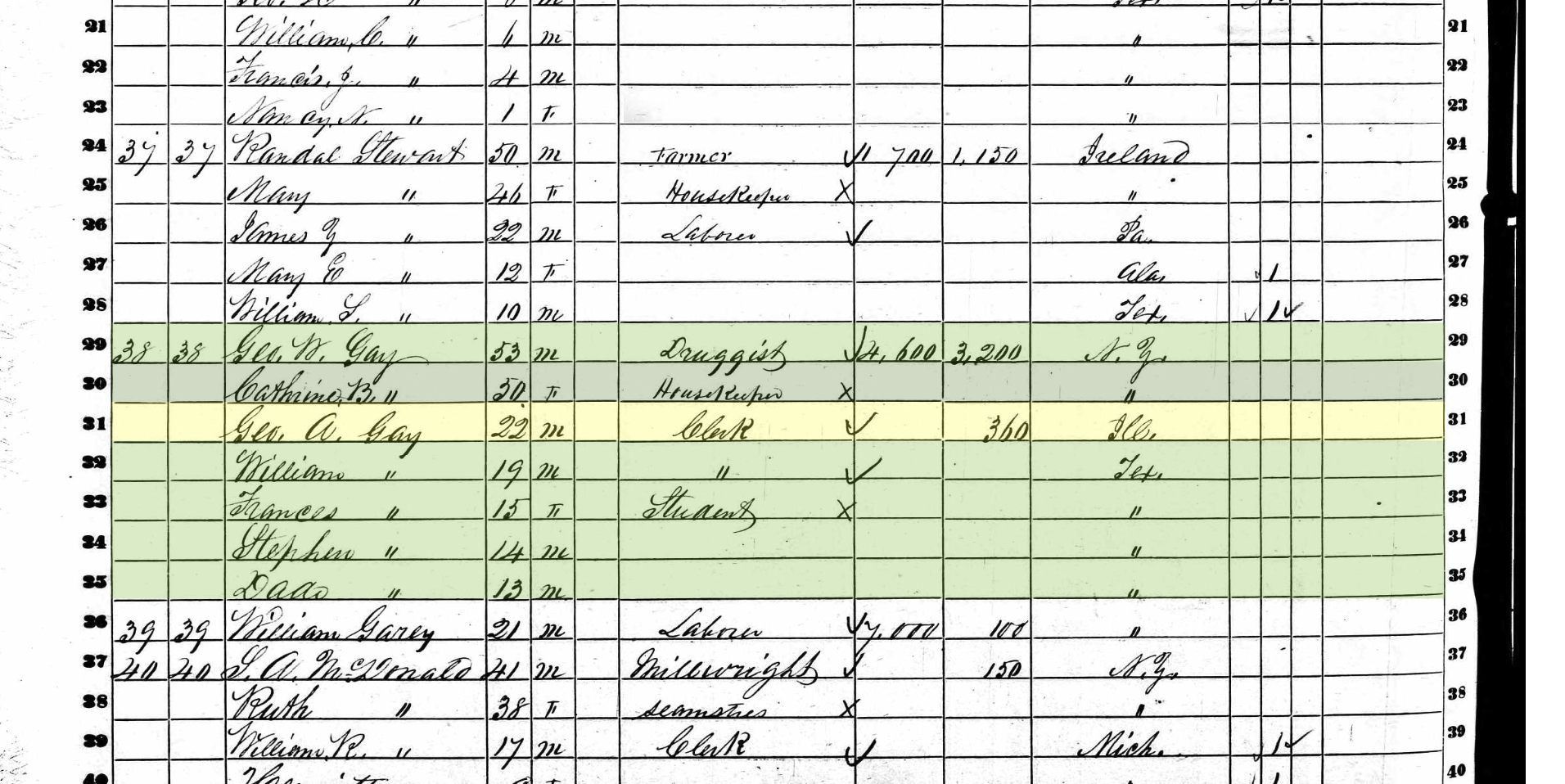 1860 United States Federal Census for Precinct 2, Post Office Wheelock, Robertson County, Texas, for George Washington GAY (1808-1899) list his occupation as druggist and his son George Augustus “Gus” GAY (1840-1879) as a clerk. George’s Real Estate Value was $4,600 and his Personal Estate Value was $3,200
